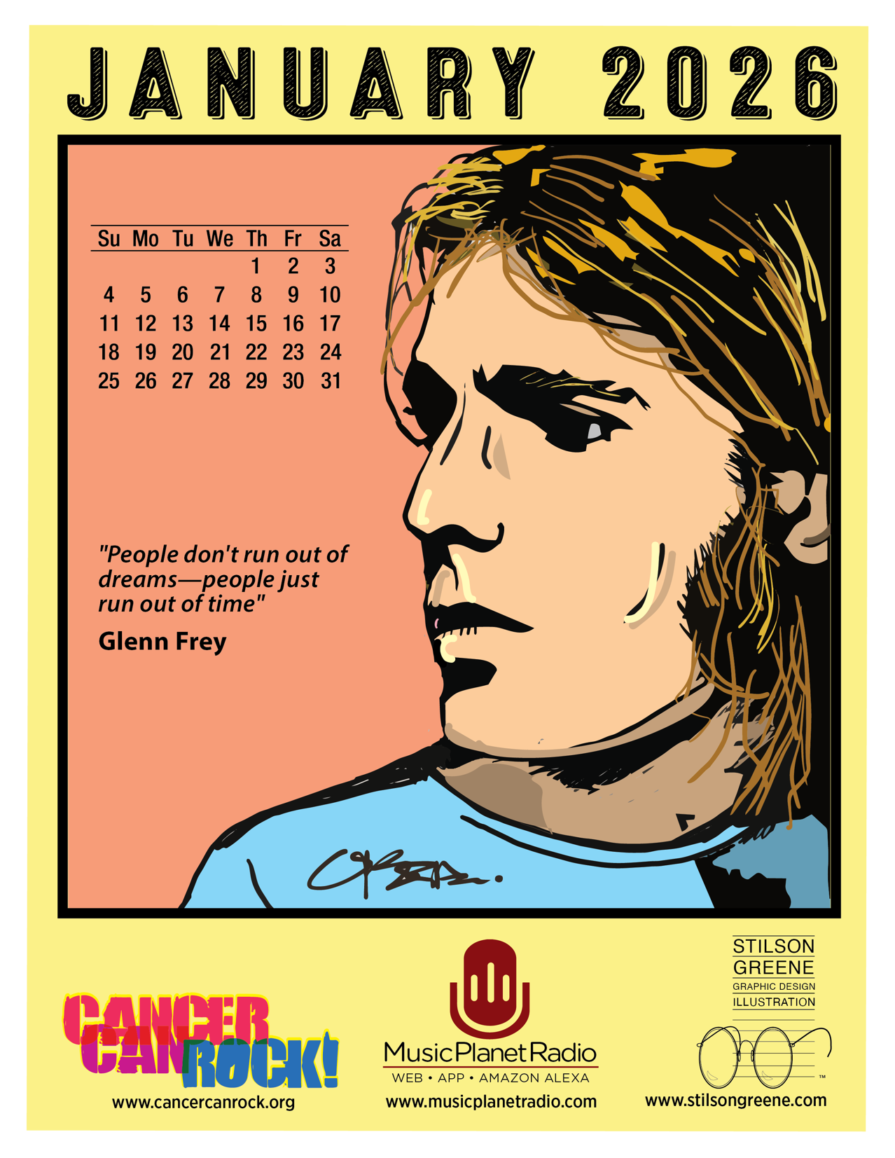 The "Your Fridge Rocks" calendar page is brought to you by Music Planet Radio, Cancer Can Rock, and Stilson Greene Graphic Design & Illustration.