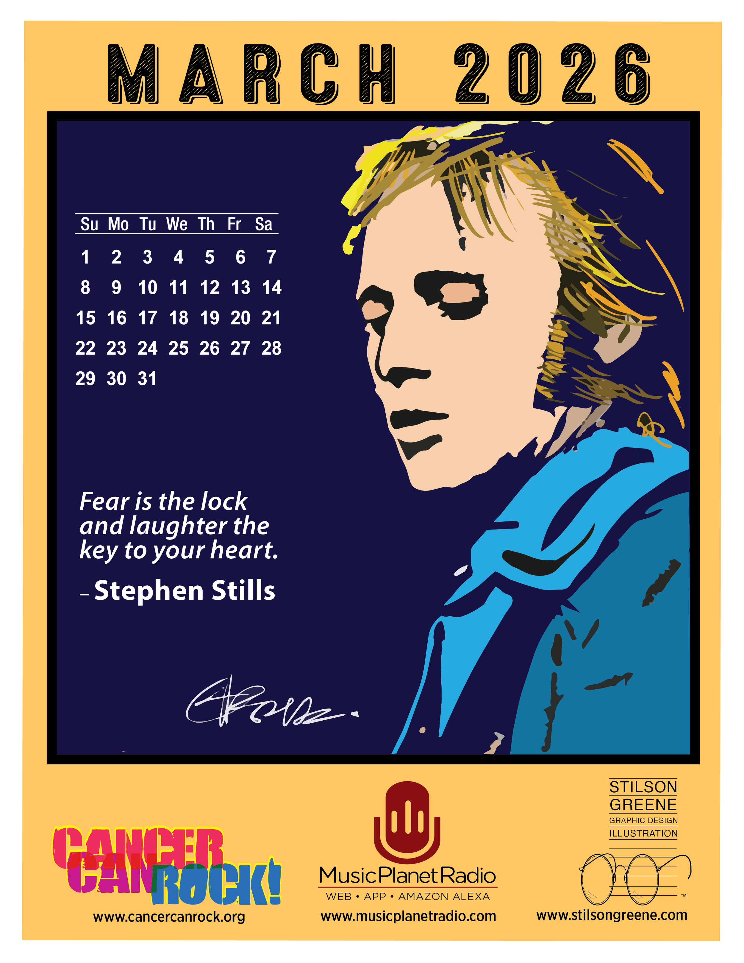 This month our printable calendar is Stephen Stills with one of our favorite quotes. The graphic is set on an 8.5" x 11" grid. Right click the image (left), save to your computer, then print a copy so your fridge can rock!