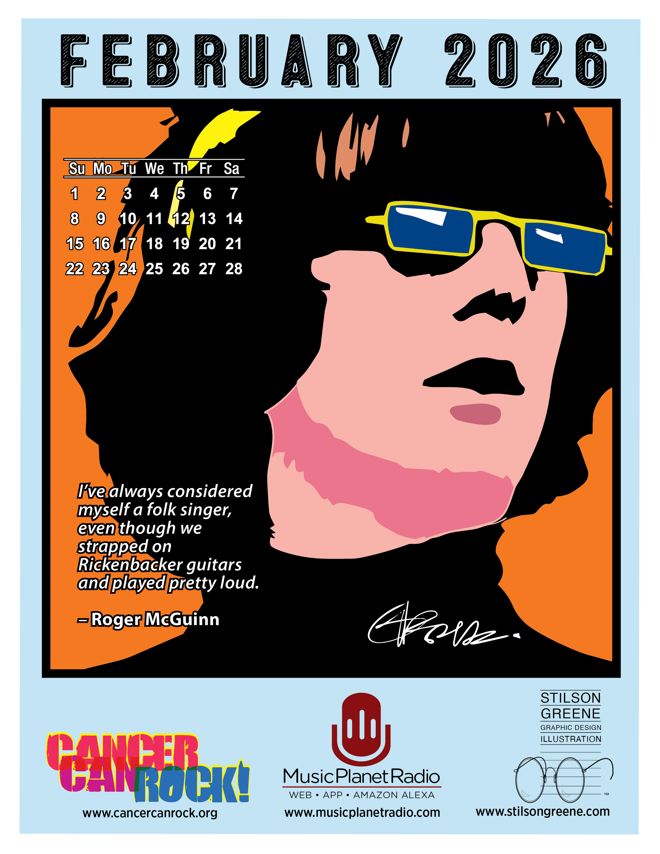 This month our printable calendar is Roger McGuinn with one of our favorite quotes. The graphic is set on an 8.5" x 11" grid. Right click the image (left), save to your computer, then print a copy so your fridge can rock!